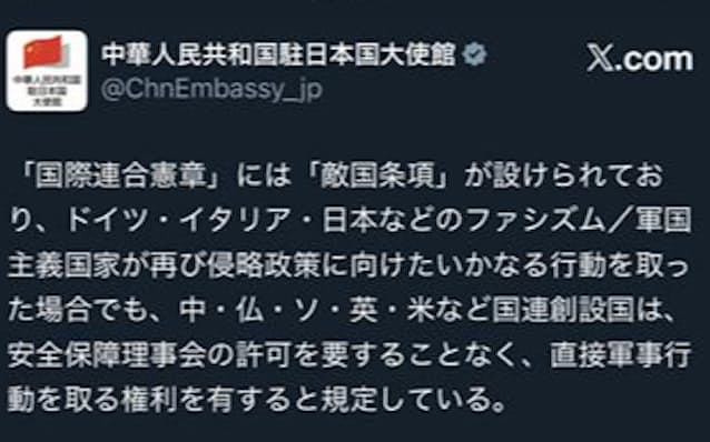 中国「国連安保理の許可なしに日本攻撃可能」 Xで旧敵国条項に言及 – 日本経済新聞