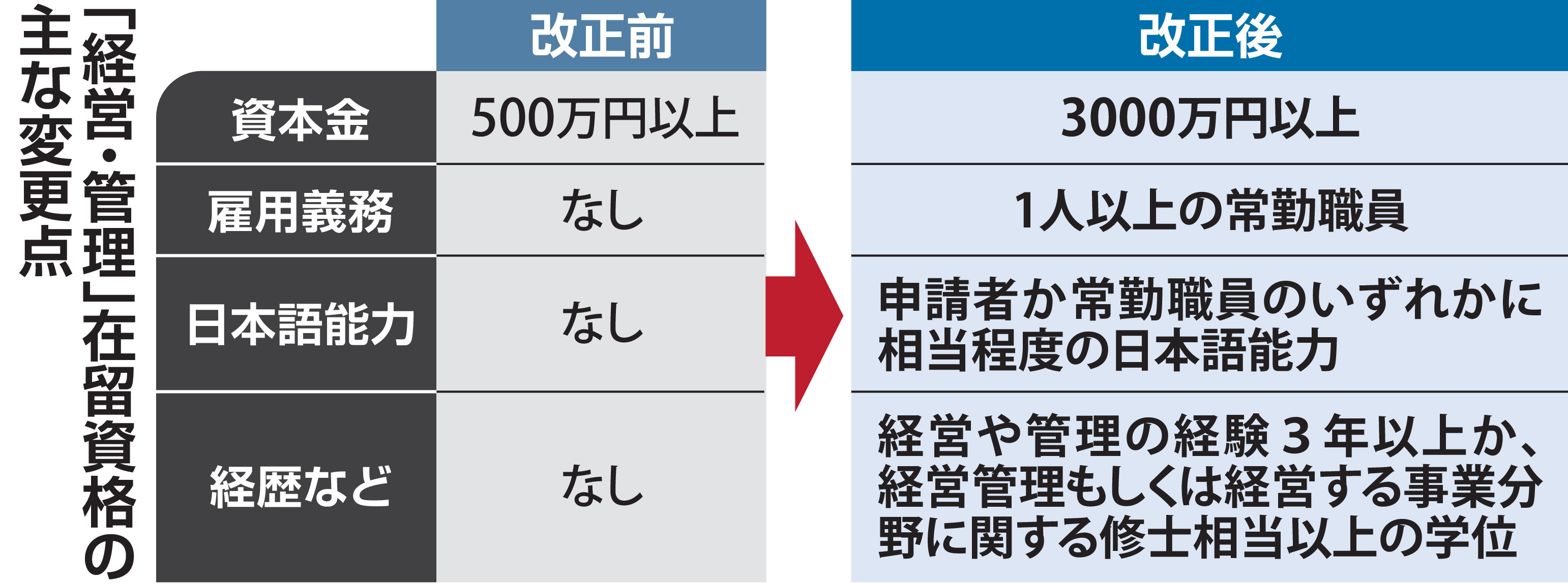 日本で起業する外国人に向けた在留資格、経営・管理の取得要件が厳格化される直前、制度の緩さを突いた「駆け込み起業」とみられる動きが大阪市内で確認された。必要な資…
